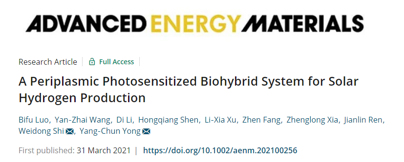 近日,正妹av 雍阳春教授团队与化工学院施伟东教授团队合作在Advanced Energy Materials杂志上发表最新研究成果“A periplasmic photosensitized biohybrid system for solar hydrogen production”。