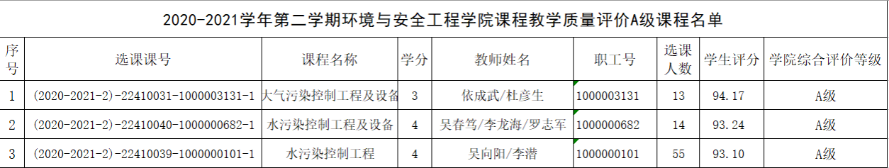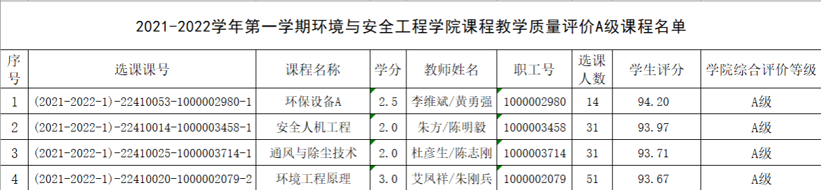2021年课程教学质量评价细则》,对本学期课程评教结果在学院排名前30%的课程,结合领导干部、同行听课情况和座谈会、信息员反馈等相关质量监控信息进行综合评价,A级教师课程班比例不超过本学期学院课程教学班总数的20%,经学院院务会研究决定以下课程作为A级教师课程班上报教务处。