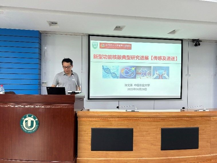 功能核酸是一类可替代传统蛋白酶及抗体,具有独立的结构,执行特定生物功能的核酸分子的统称,包括适配体、切割核酶、错配核酶、发光功能核酸、引物、核酸纳米材料、核酸金属复合物等。许文涛教授团队多年来一直致力于功能核酸的相关研究工作,从PCR克隆到核酸传感、从定性到定量、从单重到通用引物多重、从液相扩增到纸基快检、从电泳条带到现场显色,从2h扩增到2 min超速扩增、从聚合酶扩增到链替代扩增、从有酶扩增到非酶扩增、从核酸检测到非核酸检测、从引物到适配体、从无形液体到有形核酸水凝胶、从荧光标记到发光核酸、从大样本到单细胞、从基因到表观遗传等。报告会中许教授详细介绍了其团队在核酸功能材料用于生物传感器构建方面的最新进展以及在发光传感器、核酸纳米酶、核糖开关等的最新研究成果,并与现场师生进行了交流讨论,详细解答了大家的提问。