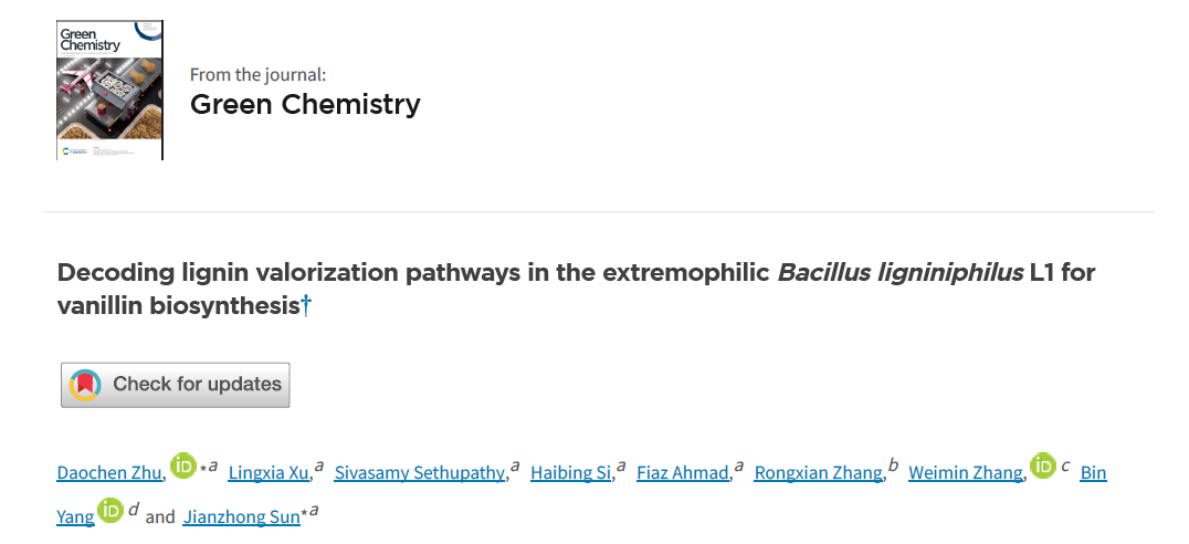 朱道辰研究员和孙建中教授团队关于木质素解聚合成香草醛方面的研究取得重要进展。相关成果以“Decoding lignin valorization pathways in the extremophilic Bacillus ligniniphilus L1 for vanillin biosynthesis”为题,发表于绿色可持续发展领域国际著名期刊《Green Chemistry》。