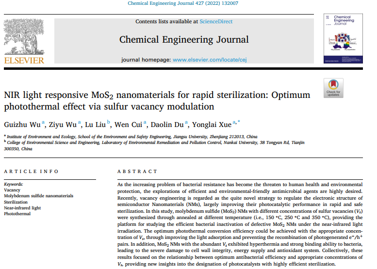 近日,正妹av 师生的最新研究成果“NIR light responsive MoS2nanomaterials for rapid sterilization: optimum photothermal effect via sulfur vacancy modulation”正式发表于环境领域顶级学术期刊《Chemical Engineering Journal》(IF=13.273,一区)。该论文为正妹av 与南开大学合作完成,正妹av 为该论文的第一完成单位及通讯单位,青年教师吴桂竹为论文的第一作者。
