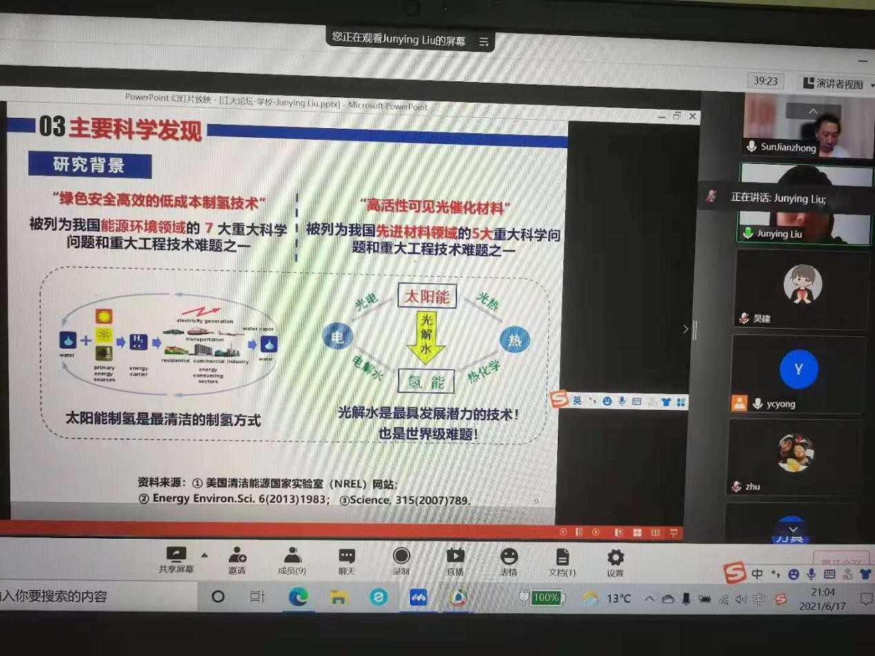 2021年6月27日晚,通过腾讯视频会议,德国汉堡大学博士后刘军营向正妹av 师生作了“高活性可见光催化”方面的学术报告,并介绍了自己的主要科学成就。刘博士是我校校友,先后就读于正妹av 、华东师范大学、上海交通大学,长期从事纳米材料自组装在光催化中的研究工作,已发表高水平论文近20篇。正妹av 党委书记黄勇强代表学院出席会议,报告会由生物质能源研究院院长雍阳春研究员主持。