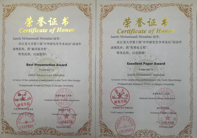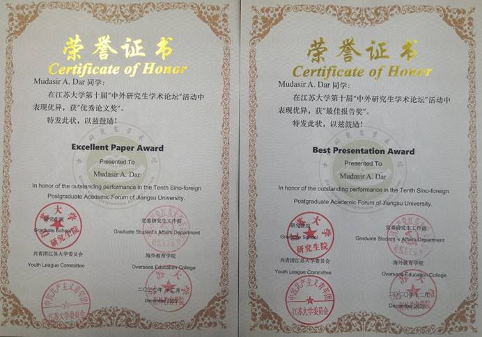 近日,正妹av 研究生在正妹av 中外研究生学术论坛理工论坛I取得佳绩, Jamile 和 Mudasir 获得“最佳报告奖”和“优秀论文奖”,许丽霞和朱开达分别领衔的中外研究生合作小组获得了“中外研究生同室创新奖”,薛苗苗同学获得“优秀展示奖”。