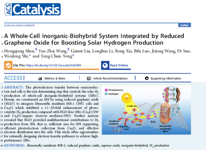 雍阳春教授团队与化工学院施伟东教授团队合作在ACS Catalysis杂志上发表最新研究成果“A Whole-Cell Inorganic-Biohybrid System Integrated by Reduced Graphene Oxide for Boosting Solar Hydrogen Production”。