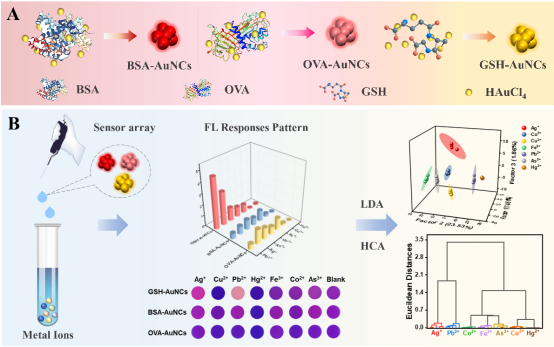 张祯教授团队基于此技术,开发了一种由3种拥有不同光学性质的功能化金纳米团簇(GSH-Au NCs、OVA-Au NCs和BSA-Au NCs)组成的荧光阵列传感器,通过传感元件之间的细微结构差异实现与目标物的不同相互作用,进而识别7种金属离子(Pb2+、Fe3+、Cu2+、Co2+、Ag+、Hg2+和As3+)。在此基础上,根据LDA(线性判别分析)和HCA(层次聚类分析)建立了一个具有组内凝聚和组间分散的高离散金属离子数据库,用于区分多种目标物(图1)。
