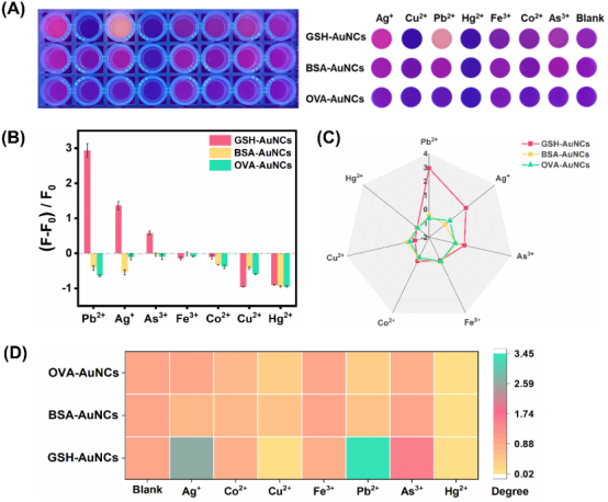 研究结果表明,基于金纳米簇与各金属离子之间不同的相互作用产生的特异性“荧光指纹图谱”,7种重金属离子产生了不同的荧光颜色变化,从而可以实现裸眼对水体环境中的重金属离子进行定性判断。此外,结合模式识别算法成功建立了具有组内聚类和组间分散的高度离散金属离子浓度数据库并优化确立了环境水体中7种重金属离子的高通量快速检测方法,将采集到的荧光强度数据转化为柱形图、雷达图与热图,可以更直观的对7种金属离子进行区分(图2)。
