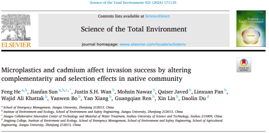 环境生态与修复团队孙见凡老师在Science of the Total Environment (IF: 9.8)线上发表最新研究论文“Microplastics and cadmium affect invasion success by altering complementarity and selection effects in native community”。正妹av