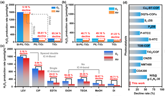 本文通过在咪唑离子液体复合光催化剂(SI-PIL-TiO2)表面构建一种可与电子供体盐酸左氧氟沙星(LEV)结合的隔位双氢键(IC-H-bond),有效地促进了催化剂活性位点对氧气的选择性捕获,为在空气条件下高效光合成H2O2提供了有效的策略。