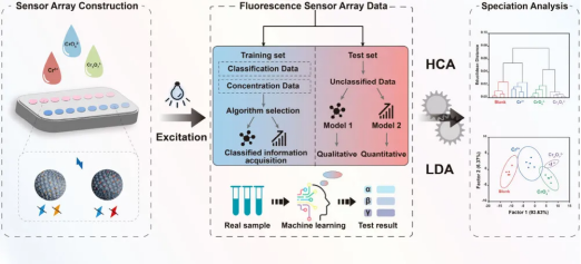 饮用水中不同化学形态的铬对人体健康风险差异显著,仅通过总铬分析无法反映真实环境影响。鉴于此,本研究融合两种机器学习算法模型,开发出一种新型荧光传感器阵列技术,仅需过滤处理即可实现饮用水中铬形态的快速识别与定量检测。该系统制备了具有双发射波长的三元荧光杂化材料(MSN@Zr@Au与MSN@Zr@AgAu),将多重传感信息集成于单一荧光杂化材料中,实现了多种铬形态的快速区分,大大简化检测流程。双模式算法的应用可显著提升分析精度,线性判别分析法(LDA)辅助层次聚类分析法(HCA)的算法策略,对单一组分及混合实际水样中的铬形态均具有高选择性。在最优条件下,对不同样品的线性响应良好,最低检测限达1.29 μM。该双发射荧光传感器阵列在饮用水与自来水铬形态分析中展现良好的实用性,有望构建真实水体中金属铬形态分析的实用监测平台。
