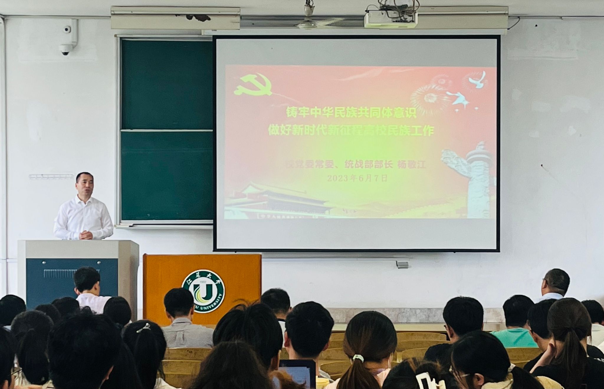 党委特邀校党委常委、统战部部长杨敬江作民族工作专题报告会,院长杜道林主持,学院全体教职工和学生党员共计200余人参加学习。