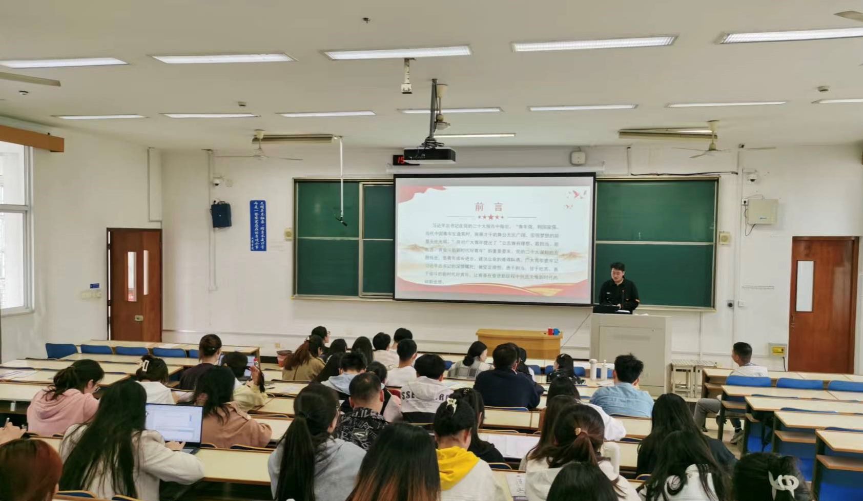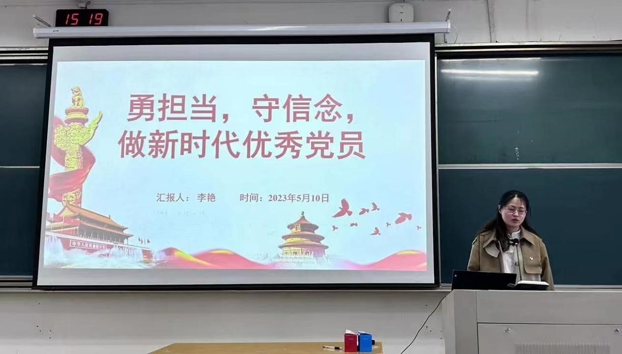 李艳以“勇担当,守信念,做新时代优秀党员”为主题,从党的自我革命这一角度入手,引入党的二十大报告内容和习近平总书记在党的二十大发出的时代号召,不忘初心,牢记使命,务必谦虚谨慎、艰苦奋斗,务必敢于斗争、善于斗争,坚定历史自信,增强历史主动,谱写新时代中国特色社会主义更加绚丽的华章。吕治邦通过回顾党的百年伟业,引用习近平总书记在党的二十大报告中强调的话语,深入解说百年大党迈上新征程再创新伟业所需要面临的新挑战和新机遇,作为新时代的青年学生,我们要以实现中华民族伟大复兴为己任,刻苦学习、努力上进,让青春在党和人民最需要的地方绽放光彩。