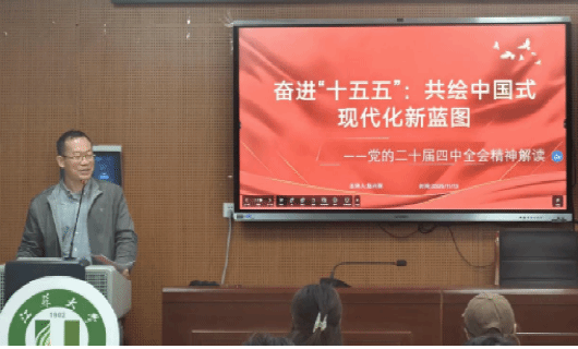 在讲解“全会的基本原则和发展目标”时,赵书记结合学院发展与学科特色,对坚持党的全面领导、坚持以人民为中心、坚持深化改革开放、坚持系统观念等基本原则进行了深入浅出的解读,并详细剖析了“十五五”时期我国发展的主要目标和2035年远景目标,引导大家将个人发展融入国家发展大局。